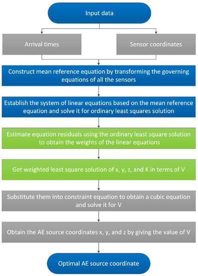 By solving the cubic equations, the variable V in closed form, denoted by , can be readily solved. There are three solutions which are then substituted into Equation (13) to obtain the AE source coordinates . However, only one real numerical solution can be determined as the final location result. When there is more than one real numerical solution, the one closest to the least square solution is retained.