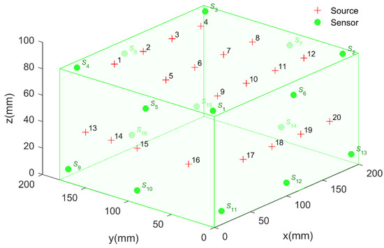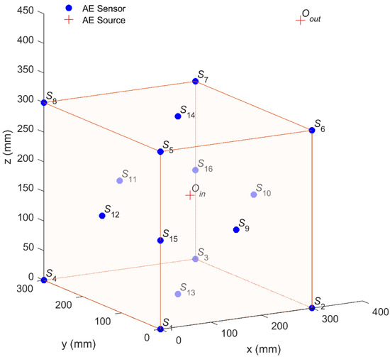 As shown in Figure 8, a cubic monitoring system with a side length of 300 mm containing 16 AE sensors is established. The coordinates of the sensors are shown in Table 3. Moreover, two virtual AE sources were used for this simulation: one was set inside the sensor array with the coordinate of (120, 80, 190 mm), and another was set outside the sensor array with the coordinate of (400, 160, 430 mm). The arrivals with the error scales (i.e., error standard deviations) of 0.3, 0.6, 0.9, 1.2, and 1.5 μs were designed as noise disturbances. Each AE source location was repeated 100 times by changing the random errors in arrivals to obtain reliable statistical conclusions.