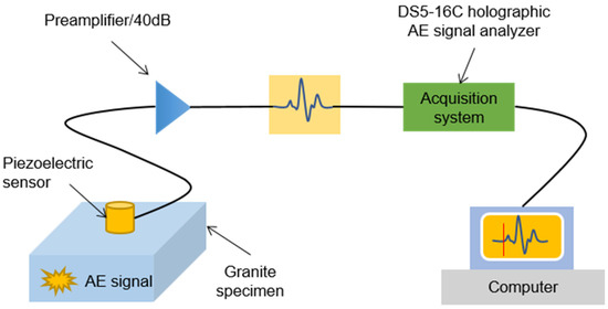 A pencil lead break experiment was performed on a monitoring system with a 200 × 179 × 84 mm granite block to verify the feasibility of the proposed method, as shown in Figure 3. Sixteen sensors 2343 mounted on the monitoring system, and their coordinates are shown in Table 1. Moreover, 20 AE sources were generated on the block surface by pencil lead breaks, and their coordinates can be seen in Table 2. It should be noted that a 0.5 mm hard-black pencil lead was used, and the lead-breaking angle with respect to the granite block surface was 30°. Then, the acoustic waves were received by the piezoelectric sensor, amplified by a gain of 40 dB, and collected by a DS5-16C Holographic AE Signal Analyzer. Finally, the acoustic waves were stored in a computer for further analysis. The entire acquisition process of acoustic waves is shown in Figure 4.