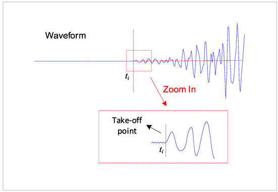 Before locating an AE source, the arrival times should be determined first. Because the power of the P wave is far higher than that of environmental noise, there will be a significant take-off at the corresponding waveform with the P wave arriving. The corresponding time of the first take-off point is generally determined as the time of arrival. Figure 5 shows the principle of the selection of arrival times.