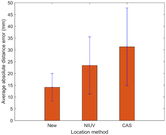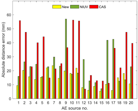 Figure 6 compares the location errors for AE sources nos. 1 to 20 as determined by the new method and two traditional methods. It can be seen that the absolute distance errors of the proposed method are generally smaller than those of the traditional methods, except for the AE sources 10, 11, 18, and 19 for the NIUV method and AE sources 6, 7, and 12 for the CAS method. Moreover, the maximum location errors of the CAS and NIUV methods are both more than 50 mm, while that of the new method is less than 25 mm. Therefore, the location performance of the new method is far better than that of the traditional methods. Figure 7 shows the average absolute distance errors and standard deviations for the location results of 20 AE sources determined by the three methods. It can be seen that the average absolute distance error and standard deviation of the proposed method are both smaller than those of the traditional methods, which further demonstrates the higher location accuracy and stability of the proposed method compared with the traditional methods. The detailed AE source coordinates of the location results for the three methods are shown in Table 2.