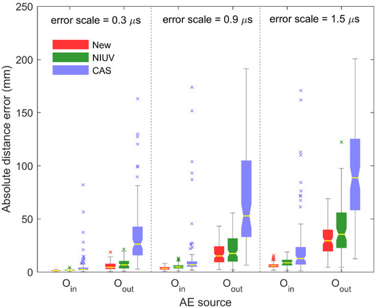 Figure 9 shows the comparison of absolute distance errors of the proposed method and the traditional methods using arrivals with error scales of 0.3, 0.9, and 1.5 μs. For each box, the position of the notch is the median; the box extends vertically between the lower quartile and upper quartile, the whiskers extend to the most extreme data that are not considered abnormal results, and the abnormal results denoted by the cross markers “×” are plotted individually. In this figure, the lower the position of the notch, the higher the location accuracy, and the shorter the box, the more stable the location accuracy. In can be seen that, regardless of whether the AE source is in or out of the array, the box of the new method is always at a lower position and shorter than the NIUV and CAS methods under different error scales. It indicates that the new method always has more accurate and stable location results under different error scales than the NIUV and CAS methods whether the AE source is inside or outside the sensor array. Because the new method considers the influence of the reference sensor, estimates the equation residuals, and embeds the parameter constraint, better positioning results are obtained.