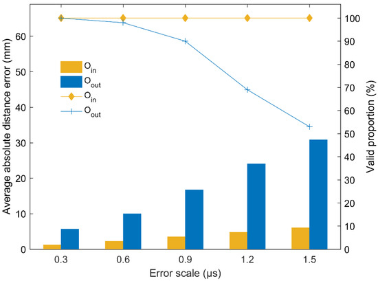 The average absolute distance errors and valid location proportions of the proposed method for the AE sources inside and outside the array under different error scales.