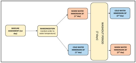 A descriptive analysis of the main categorical and continuous variables was performed initially, prior to further analysis. Continuous variables are expressed in mean and standard deviation (SD) while categorical variables are represented in absolute values and corresponding percentages. Distribution was assessed for every continuous variable using the Shapiro–Wilk test. Log10 transformation was performed when variables were not normally distributed. A repeated-measures analysis of variance (ANOVA) was performed with time (PRE, POST, POST10′, POST20′, POST30′, and POST40′) as within-subject variables, and temperature (cold water and warm water) as the between-subject factor. When a significant F ratio was obtained, a Bonferroni post hoc test was used to evaluate time and temperature differences. Partial eta-squared effect sizes were also calculated to account for the effect of time and temperature on both Dm and Tc. Statistical analysis was performed using the statistical software SPSS v.21, IBM® (IBM Corporation, Chicago, IL, USA), with a statistically significant level set at <0.01 according to the Bonferroni correction for multiple comparisons.