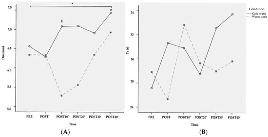Changes in Dm (A) and Tc (B) after CWI and WWI (raw data—variables non-transformed). * = Significant interaction condition by time; § = Differences of cold-water condition with respect to PRE; # = Differences of warm-water condition with respect to PRE.