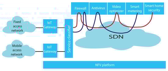 - Ojo, M.; Adami, D.; Giordano, S. A SDN-IoT Architecture with NFV Implementation. In Proceedings of the 2016 IEEE Globecom Workshops (GC Wkshps), Washington, DC, USA, 4–8 December 2016; pp. 1–6. [Google Scholar]