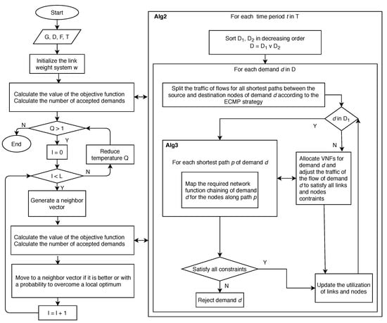 We propose a heuristic algorithm for finding an approximate solution of the three problems in a large-scale vIoT system. The objectives are as follows: (1) maximizing the total satisfied traffic, (2) maximizing the number of accepted service demands, and (3) minimizing the total network routing cost in the vIoT system. The proposed algorithm contains two primary components: (i) optimizing the link weight system while considering the differentiated demands, the dynamics of service demands, and available resources (i.e., Algorithm 1: Optimizing the link weight system); (ii) deciding a routing solution based on the link weight system vector, service demands, and available system resources by the ECMP technique (i.e., Algorithm 2: TrafficDecision, Algorithm 3: VNFAllocation). The algorithm is deployed as a component in the NFV orchestrator block of the NFV reference architecture framework (Figure 4 in [29]).