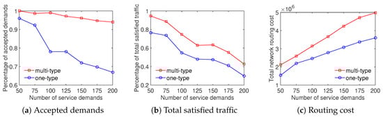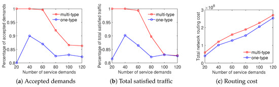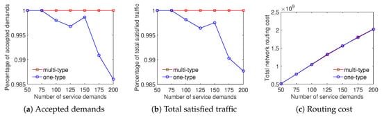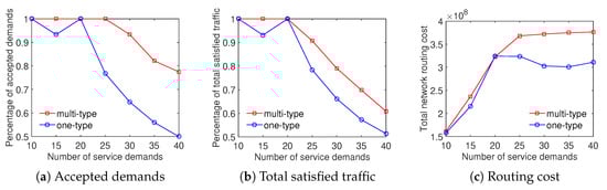 In four scenarios, the experiment results show that the Multi-type scheme outperforms the One-type scheme in both the total satisfied traffic objective and the ratio of accepted demands objective. Particularly, Figure 4 shows that the ratio of satisfied demands achieved by the Multi-type scheme is higher from 5% to 25% than that of the One-type scheme for the Internet2 dataset. The result of the percentage of total satisfied traffic is similar in this case. It can be seen from Figure 4c that the Multi-type scheme achieves a higher total network routing cost than the One-type scheme. The main reason is that the Multi-type scheme supports for much more network throughput therefore its resource utilization is larger. We can observe that the Multi-type scheme overcomes the One-type scheme not only the accepted demands and total traffic but also the total network routing cost in Figure 5 with the Bcube dataset. Moreover, the gap between the effective performance of the Multi-type scheme and the One-type scheme becomes larger with the increase of number of service demands when evaluating the ratio of supported demands and total satisfied traffic in Figure 5a,b. Figure 6 and Figure 7 illustrate the similar results for the Geant and Two-tier datasets. To summarize, the approach considering differentiated demands is effective in maximizing the total satisfied traffic.