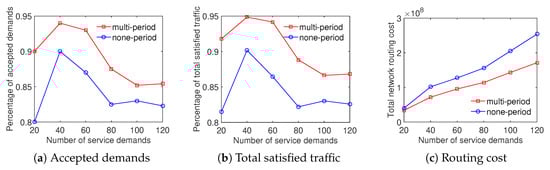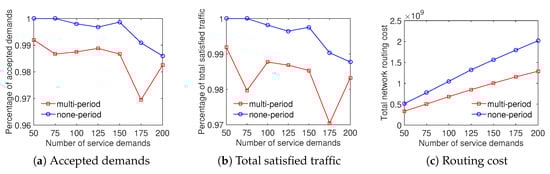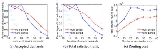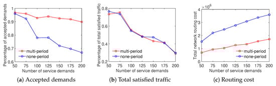 In addition, we use Equation (25) to calculate the ratio of accepted demands for time period t where is number of service demands that the system can serve for time period t. Equations (26) and (27) are used to estimate the ratio of total satisfied traffic and the ratio of total network routing cost for time period t, respectively. These equations are as follows: