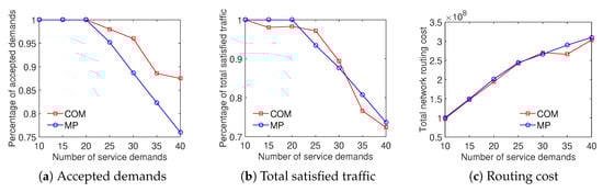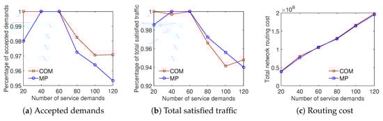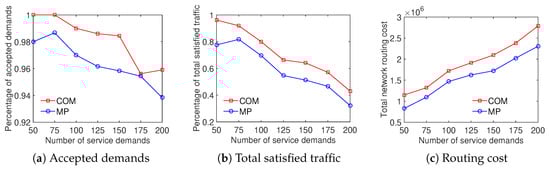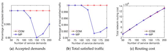 The results illustrate that the COM scheme achieves a higher ratio of accepted demands than the MP scheme while both the total satisfied traffic and the total network routing cost results are equivalent. As shown in Figure 12, the ratio of accepted demands obtained by the COM scheme is better than that of the MP scheme with the Internet2 dataset. In addition, on the percentage of total satisfied traffic and the total network routing cost aspects, the results are very closed. Figure 13 compares the traffic solution considering the COM scheme to the MP scheme with the Bcube dataset. It shows that COM outperforms MP in both the ratio of accepted demands and total satisfied traffic while having the same total network routing cost. For the Geant dataset, Figure 14 shows that the COM scheme achieves at least 20% higher ratio of total satisfied traffic than the MP scheme with a number of service demands from 50 to 200. The total network routing cost of COM is higher than that of MP because of the extreme increment of satisfied traffic. The comparison between COM and MP with the two-tier dataset also shows a similar result, presented in Figure 15. To summarize, the aggregation of the multiple time periods scheme and the differentiated demands scheme provides an effective solution for traffic engineering with multiple objectives.