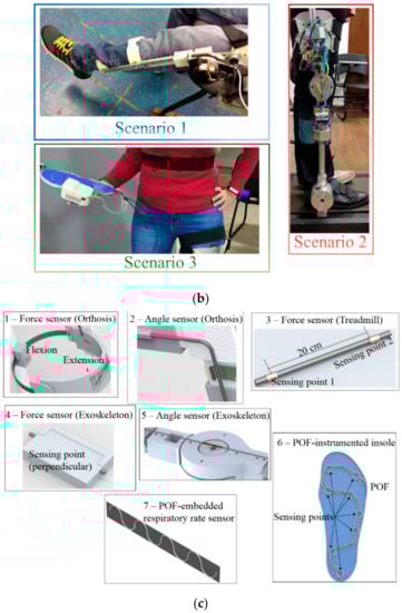 (a) Schematic representation of the scenarios proposed, (b) a photograph of the devices for each scenario and (c) the devices used for the polymer optical fiber (POF)-instrumented robot-assisted rehabilitation clinic.