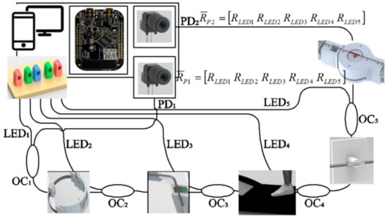 There are many optical fiber sensor technologies, which include sensors based on nonlinear effects [17], fiber Bragg gratings (FBGs) [18], interferometers [19] and intensity variation-based sensors [20]. Most of the aforementioned sensors need equipment such as an optical spectrum analyzer in order to acquire the sensor response. Besides the low portability, such devices have high costs, which will contribute to the increase in the robotic system costs. Compared with FBGs, the proposed sensor system has similar multiplexing capabilities with the possibility of obtaining similar spatial resolutions but with a cost some orders of magnitude lower. It is also worth mentioning that the proposed approach does not need bulky and high-cost equipment for sensor interrogation, which, generally, also presents low acquisition frequency, limiting applications in dynamic movement assessment.