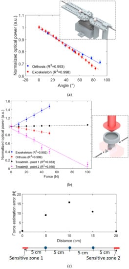 The results presented in Figure 3 indicate that each sensor has a linear behavior with a determination coefficient (R2) close to or higher than 0.99 in all analyzed cases. Furthermore, it is possible to calculate the slope of each sensor response in order to obtain the sensitivity of each sensor. It is also worth noting that the sensors in Figure 3b have different polarities, i.e., some of them have an optical power increase with the force application and the others, a decrease in the optical power. Such behavior is related to the orientation of the lateral section in each sensor with respect to the point of force application, where different orientations lead to variation not only in the sensor polarity but also in the sensor sensitivity. In addition, the force sensors showed high repeatability in the performed characterization tests, where the standard deviations were as low as 0.05 u.a., which indicates the feasibility of the sensors in repetitive tests. The RMSE of each sensor was also evaluated. Considering the force estimation of each sensor, the lowest RMSE was found in the force sensor for orthosis instrumentation (RMSE of 0.62 N), indicating a high accuracy of such sensors. The POF force sensor for the exoskeleton also showed a low RMSE (1.58 N), whereas the highest ones were found in the treadmill sensors (Points 1 and 2). The analysis of the force sensors in the treadmill shows RMSEs of 2.84 N and 5.42 N for Points 1 and 2, respectively. Such errors can be attributed to minor differences in the weight placement along the optical fiber, which leads to errors in the force estimation. In order to evaluate the error as a function of weight positioning on the treadmill, Figure 3c shows the estimation error when a 100 N force is applied on each point indicated in the figure inset. The results indicate that the error increases as the distance of the weight placement increases. Thus, the highest error is found at the distance of 10 cm, which is the farthest from the sensitive zones. In this case, the errors were as high as 15%; however, it is worth noting that the treadmill has markers for optimal foot placement in the tests and foot positioning at a 10 cm distance from the sensor is unlikely to happen, since this position represents the center of the treadmill and is not normally reached during gait. Moreover, in the treadmill tests, the user has the exoskeleton attached, whose movements occur only in the sagittal plane, which results in an additional constraint for lateral deviations in foot placement on the treadmill.