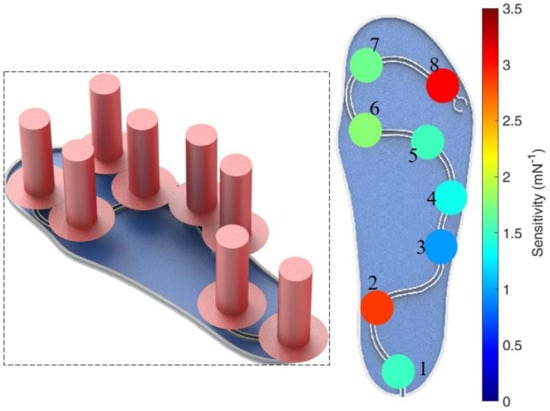 Regarding the sensors for the third scenario, i.e., the POF-instrumented insole and POF-embedded smart textile, the characterization procedure is also applied. In the POF-instrumented insole, the forces (from 0 N to 100 N) are applied at each of the eight sensitive zones produced in the fiber. The applied forces are close to the maximum force at each region as measured in previous studies [23]. In this case, it is important that all the measurement points have similar sensitivities in order to provide similar contributions of each sensor to the GRF curve [31]. Figure 4 shows the sensitivity of each point in the insole characterization; the sensitivities are represented as a colormap in order to provide a better visualization of the sensitivity distribution in the insole. It is worth mentioning that all sensing points presented a linear response in the force characterization, where the determination coefficient is close to or higher than 0.99 in all cases. The differences in the sensors’ sensitivities are due to their positioning on the insole, where some sensors have lower curvature radii and, in some cases, the lateral section in the fiber needs to have a lower length due to the physical restrictions in the insole. For example, the region of Sensor 3 has a lower curvature radius, leading to the lower sensitivity of these sensors. In addition, some minor deviations in the lateral section depth and surface roughness can lead to variations in the sensor sensitivity as discussed in [30].