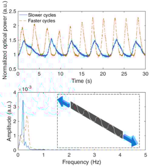 The characterization of the POF-embedded smart textile for breath rate monitoring is achieved by performing oscillatory stretching cycles with a controlled frequency/period for 30 s. The characterization tests are performed at two different rates: six cycles and 11 cycles in 30 s. In order to obtain the respiratory rate, an FFT is applied on the signal and the peak frequency is related to the breath cycles per second. In order to obtain only the frequency response related to the breathing cycles, a second order Butterworth filter is applied on the frequency window of 0.05 Hz to 0.5 Hz, which is the region related to the respiratory rate. Figure 5 shows the characterization in the time and frequency domains for both signals; a schematic representation of the experimental setup is shown in the figure inset. As shown in the time-domain signal, there are six cycles in one test and 11 in the other. If the signal in the frequency domain is analyzed, there is a peak at 0.20 Hz for the first test and one at 0.35 Hz for the second test, which are related to six cycles in a 30 s interval for the first and 10.5 cycles for the second test. These results indicate the feasibility of the proposed approach for estimating the respiratory rate, since the breath leads to a similar periodic response on the sensor (as discussed in [32]).