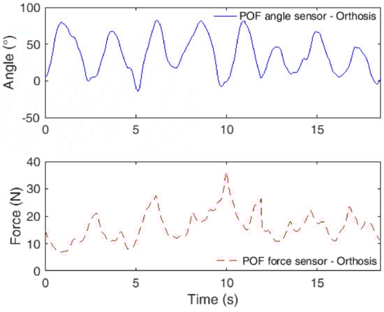 Each volunteer chooses one scenario, i.e., one volunteer chooses Scenario 1 and the others, Scenarios 2 and 3. One male volunteer is designated for Scenario 1 and the orthosis is positioned on his left leg for sequential flexion/extension cycles. The angle and force responses from the POF sensors are presented in Figure 6 for this test.