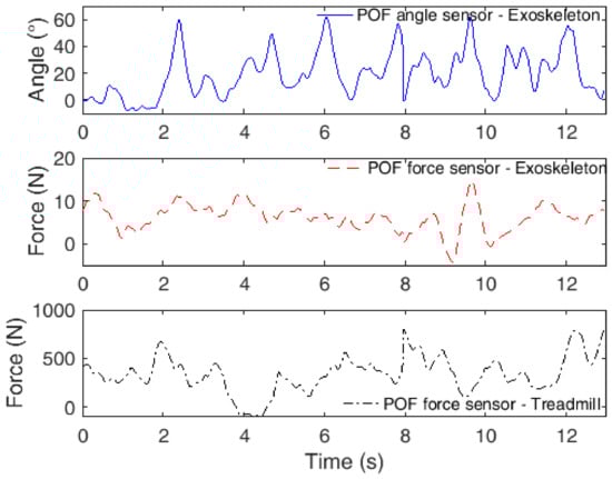 Concurrently with the flexion/extension cycles using the orthosis, there is also a robot-assisted gait test using the knee joint of the modular exoskeleton, where both the exoskeleton and treadmill are instrumented with POF sensors. In this case, the other male volunteer is asked to walk on the treadmill at constant velocity for about 5 min. Since each gait cycle has about a 1 s duration, we limited the analysis to 12 s in order to present the cycles in detail. Figure 7 depicts the results obtained with the integrated POF sensor system for angle and force assessment, where the interaction was measured between the human and the exoskeleton as well as that between the human and the treadmill in order to detect heel strike and toe off phases.