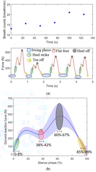 (a) Ground reaction force (GRF) and respiratory rate monitoring in gait cycles using POF-based sensor systems. (b) Mean (solid line) and standard deviation (shaded line) of the GRF estimated with the proposed insole for the tests in the third scenario. The intervals of the gait events detected are also presented.