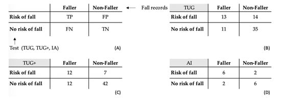 - Schoene, D.; Wu, S.M.-S.; Mikolaizak, A.S.; Menant, J.C.; Smith, S.T.; Delbaere, K.; Lord, S.R. Discriminative ability and predictive validity of the timed up and go test in identifying older people who fall: Systematic review and meta-analysis. J. Am. Geriatr. Soc. 2013, 61, 202–208. [Google Scholar] [CrossRef]