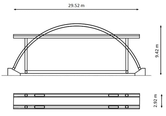 Geometric characteristics of the Kanellopoulos timber bridge (Patras, Greece). Top: side view, bottom: plan view.