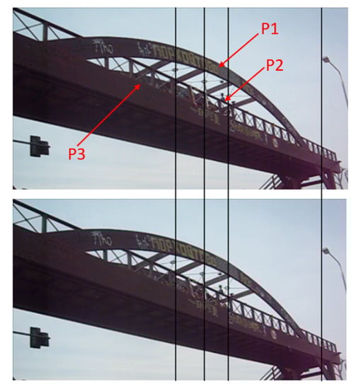 For each of the two measurement years, namely 2013 and 2015, three control points were identified on the south face of the bridge, which were clearly visible in all frames. Point 1 (P1) was near the crown of the bridge, close to its midspan, next to a GPS/GNSS. Point 2 (P2) was at the midspan, on the top of the handrail of the bridge, close to a collocated GPS/GNSS, a reflector of the robotic total station, and an accelerometer. Finally, Point 3 (P3) was at about one-fourth of the span, close to an accelerometer (Figure 2). Near each point, it was possible to identify and measure at least two vertical and two horizontal bridge elements, the edges of which were clearly identified in all video frames such that the scale corrections of Equation (2) were computed. Furthermore, stable reference points were identified in all frames.