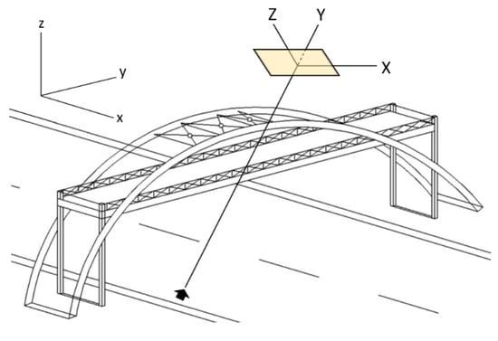 The Cartesian coordinates of the bridge (x, y, z) were transformed into a Cartesian coordinate system (X, Y, Z) defined by the camera image plane (shown as the shaded box). Dynamic displacements along the longitudinal axis y of the bridge were minimal, if any, and the dynamic deformation of the bridge was expressed by deflections confined to the x–z plane. For this reason, a simple linear relationship connected the dynamic deflections of the bridge in the x–z plane with the X–Z plane of the camera image. The black arrow indicates the camera.