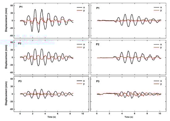 The previous knowledge of the structural characteristics of the bridge indicated that during excitations, such as those analyzed, the lateral deflections at P2 were expected to reach and even to exceed an amplitude of several centimeters; this was consistent with the results of Table 2 and Figure 4.