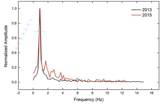 A comparative plot of the spectra of the free attenuation intervals of the oscillation of point P2 for the two years. The spectra are normalized to their maximum amplitude and reflect the first lateral modal frequency of the bridge (only the free attenuation intervals were analyzed).