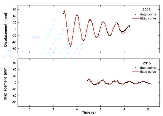 Because of their design, the analyzed videos covered the transient part of the oscillations and its free attenuation. The latter could directly (i.e., without any formal structural identification analysis) lead to two important characteristics of this bridge: its main modal frequency f along the main lateral axis and the damping factor (attenuation coefficient) ζ. f was computed through spectral analysis of displacements x(t), while ζ is computed through a least-squares analysis of Equation (9):
