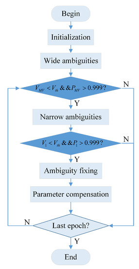 Based on the conventional ambiguity success rate constraint in screening the ambiguity subset [35,36], the ambiguity fixing algorithm adds the threshold constraint as shown in Figure 4. , are the wide-lane ambiguity residual and narrow-lane ambiguity residual in the current epoch, respectively. is the ambiguity residual threshold constraint. , are the wide-lane ambiguity success rate and narrow-lane ambiguity success rate in the current epoch, respectively.