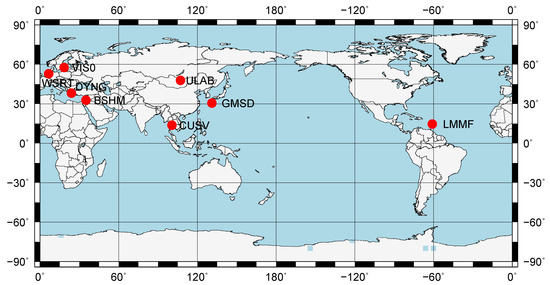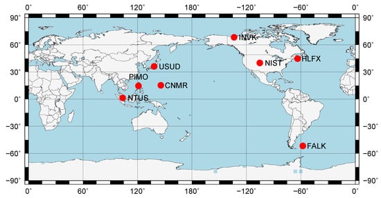 There are 499 globally-distributed reference stations at the Crustal Dynamics Data Information System (CDDIS), of which 358 stations have the week solution of coordinate in the file igs18P1996_all.ssc. According to the two constraints, we chose the stations around pan-pacific (CNMR, FALK, HLFX, INVK, NIST, NTUS, PIMO, and USUD) shown in Figure 5.