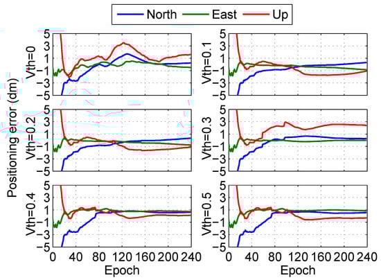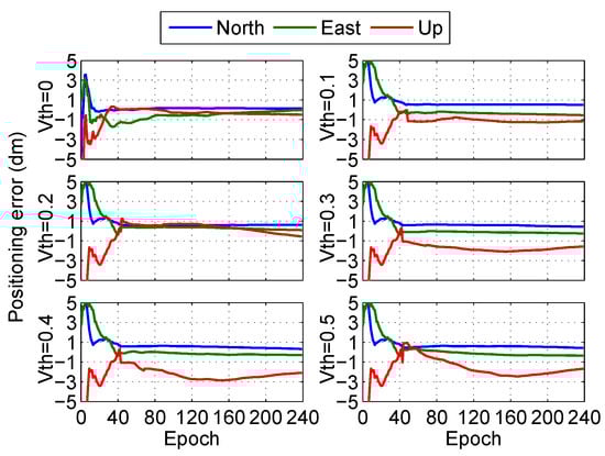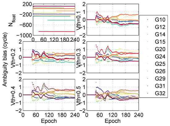 According to the convergence time from Figure 6, it can be seen that the positioning performance is the best when the threshold . Meanwhile, the residuals between fixed ambiguities and floating ambiguities under different thresholds are analyzed, as shown in Figure 7. It is found that when the threshold or , the residuals between fixed ambiguities and floating ambiguities are all within 1 cycle, but Root Mean Square (RMS) of ambiguity resolution in is the best. The conclusion is consistent with the positioning performance. In the post-processing PPP, we set the threshold .