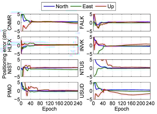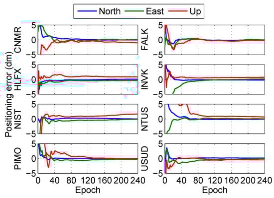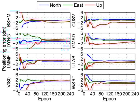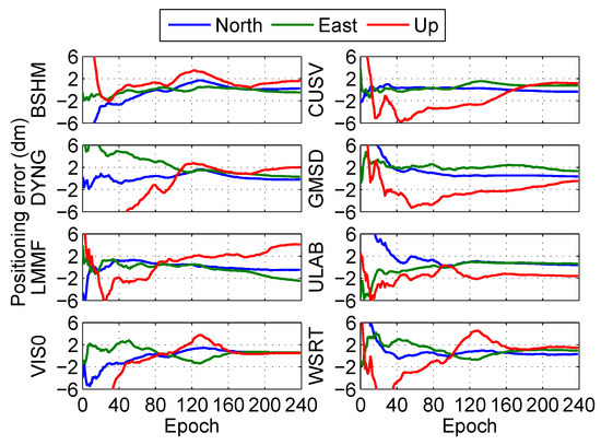 Meanwhile, the positioning performance of the eight stations is calculated in detail as shown in Table 3, where the convergence time is the instant that the positioning error in each direction is less than 0.1 m and this state can last for 20 epochs after the instant. The accuracy is the average value of the positioning error after convergence, and the precision is the root mean square of the positioning error after convergence which reflects the jitter of the positioning error. The horizontal positioning component is more accurate than the vertical component, similarly to the study by Choy et al. [40]. Compared with float solutions, the average convergence time of fixed solutions was reduced by 5.1 min (15.8%), but both the accuracy and the precision remained at the same level.