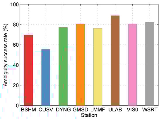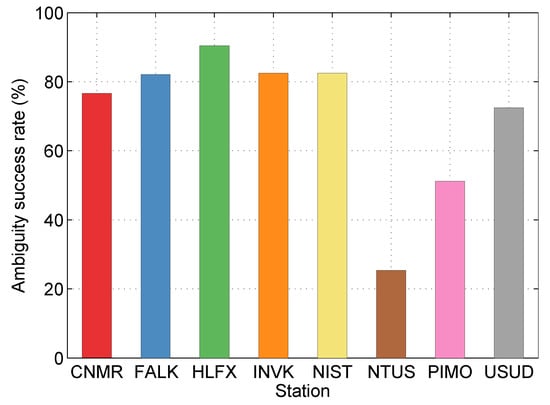 In the real-time PPP, the ambiguity success rates at different stations are calculated, and they are illustrated in Figure 17. Considering that there is also no estimated FCB in the first five minutes (10 epochs), the true ambiguity success rate will be higher, about 1.05 times of the statistics.