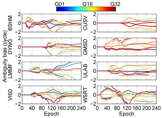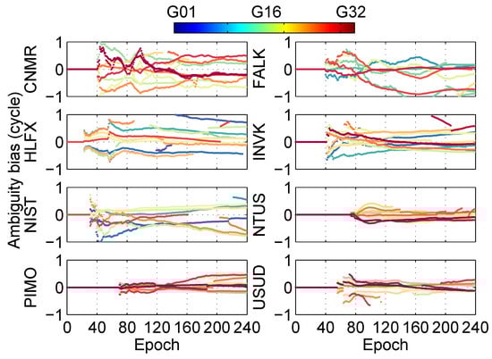 In the real-time PPP solution using ionosphere-free combination at different stations, the residuals between fixed ambiguities and floating ambiguities are shown in Figure 18. The result shows that the ambiguity residuals at eight stations are mostly within two cycles.