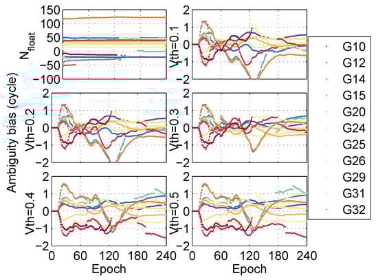 Taking the CNMR station as an example, the influences of the different thresholds on the PPP-PARC are analyzed with a step length of 0.1 cycles as shown in Figure 6, where the threshold is a float solution and the threshold is a pseudo fixed solution.
