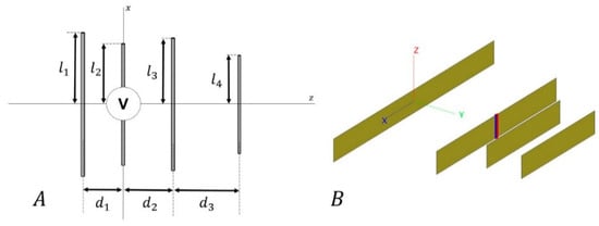 (A) Sketch of a Yagi–Uda antenna. The length of one dipole is twice the length . The distance between the dipoles denotes spacing between the element and . All these variables are expressed in terms of . The second element was used as the active element. (B) Detail of a Yagi–Uda antenna model in the 3D electromagnetic simulation software suite FEKO [33].
