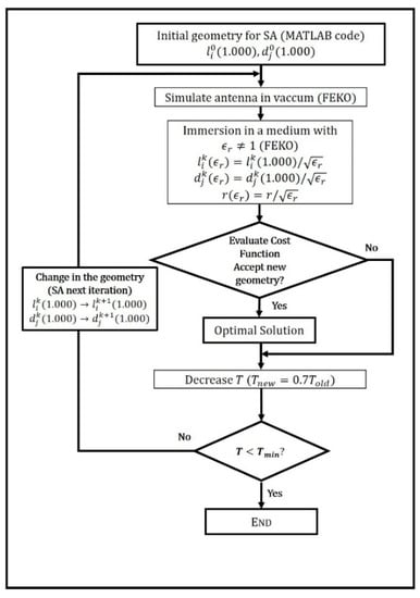 Flowchart of the optimization strategy combined with the numerical approach for the immersion process of the Yagi–Uda-like antennas in a dielectric medium. The parameters and are the lengths and spacings (in terms of λ) and r are the radii of the antennas, which have been fixed to a value of 0.75 mm in the vacuum. The initial value of the T parameter involved in this SA strategy (linked to the randomness of the search of the algorithm) was set as 100.