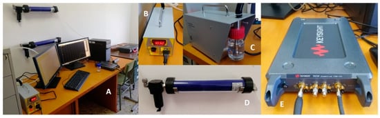 (A) General view of the exposure set-up. (B) Polydisperse test aerosol generator TSI 3073. (C) Detail of the liquid solution to be introduced into the system for creating the suspension of particles. (D) Diffusion dryer (TSI 3062) for drying the initial liquid solution introduced in (C,E) Vector Network Analyzer Keysight P9372A (300 kHz to 9 GHz).