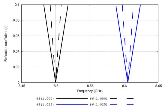 Figure 7 shows the behavior of the reflection coefficient of two antenna examples of Table 2: antenna number 3 and antenna number 6. By analyzing this figure, a decrease of the bandwidth is caused by the high Q value (the ratio between the resonance frequency and the frequency range in which the reflection coefficient is below 0.2) of the antenna number 6 versus the antenna number 3. Differences between the slopes in the reflection coefficient function are quite significant between these two examples. Otherwise, it can be interestingly noted that the frequency shift suffered by the antennas must be related with the introduction of different permittivity values. It has been found that this shift is exactly the same among all the proposed antennas of this study. This comparison is illustrated in Figure 7.