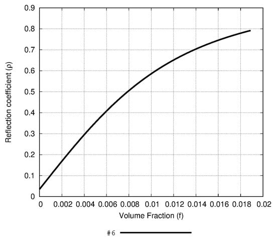 Figure 8 shows the direct relation between the reflection coefficient and the volume fraction of the antenna 6 of Table 2 in a concrete PM inclusion (soot particles) scenario. This test case is based on inclusions of 0.2 μm of diameter (PM2.5), i.e., with a relative permittivity of [41] which is within an environment at a pressure of 1 atm, while a relative humidity level of 60% and a temperature of 20 °C were assumed . The curve was obtained by following the Bruggeman formula (setting in Equation (7)), which assumes that the pollutants tend to be clustered [32]. Due to the smoothness of this function, it is possible to identify the reflection coefficient in terms of the volume fraction of soot particles inclusions. Therefore, by analyzing Figure 8 it can be claimed that this antenna example represents a feasible method to monitor PM polluted scenarios.
