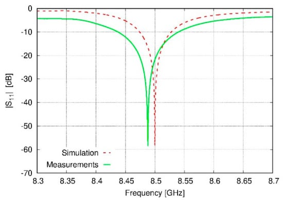 Based on the previous simulations, a prototype with the specifications of antenna 6 has been constructed (see Figure 9); the real dimensions are shown in Table 4. In the final design, a balun feed—based on a microstrip with optimized characteristics for matching the antenna to the line—has been introduced. A comparison between the simulated and the measured S11 is shown in Figure 10. Although there is an evident degree of similarity between the two scenarios, differences in terms of resonant frequency (8.488 GHz versus 8.500 GHz) and bandwidth (1.23% versus 0.63%) are reflected in the results. The inclusion of Teflon sticks—to keep the distances between the elements of the array—in addition to the use of a microstrip balun for feeding purposes are error sources which must be taken into account in order to explain these discrepancies between the data. Additionally, it must be noted that ambient parameters (as they have been discussed in the Materials and Methods section) have been playing a role in these measurements (due to the fact that the design of these devices has been developed in vacuum, instead of air with certain temperature, humidity, and pressure).