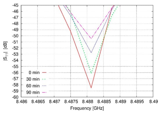 Measured |S11| curves of the antenna near to the resonant frequency for different times of exposure.
