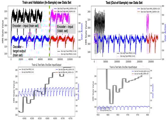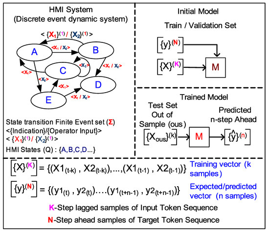 | n-step ahead sequence of HMI indication () and user input () events containing samples of feature vector values used as model training target output pattern (ground truth). = , …,. is the expected output event sequence or translated HMI DES state vector of . |