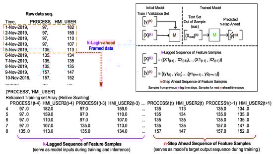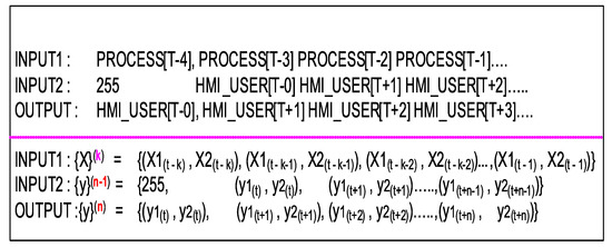 | k-lagged sequence of HMI indication () and user input () events containing samples of feature vectors used as model training input pattern. = , …, is a DES HMI state vector of . | |