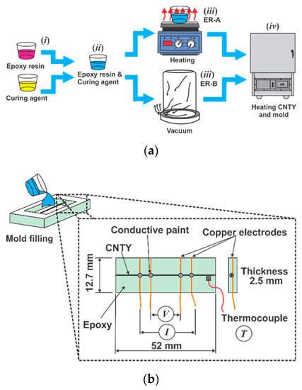 Manufacturing and in situ electrical measurements of carbon nanotube yarns (CNTY)/epoxy specimens. (a) Sequential steps for specimen manufacturing (mold filling), (b) in-situ electrical measurements and dimensions of CNTY/epoxy specimens. Steps related to heating are not used for epoxy resin (ER)-B-RT and ER-B-50.