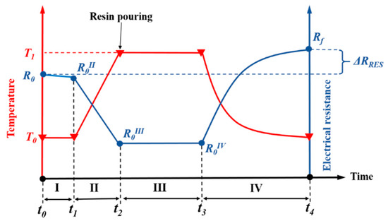 The electrical measurements were conducted in situ during resin curing, starting few minutes before, and continuing during resin pouring and subsequent curing of the resin poured into the mold. The four-point probe method was used to calculate electrical resistance (R), by measuring the voltage drop (V) between the inner electrodes, under an applied constant current (I), as depicted in Figure 1b. This was performed using a National Instruments (NI) PXI-4072 LCR card mounted in a NI PXI-1033 chassis (Austin, TX, USA). A K-type thermocouple was used for temperature measurement (T), placed slightly above the CNTY, as shown in Figure 1b. The thermocouple was connected to an NI 9211 card mounted in a NI cDAQ-9178 chassis. The electrical resistance (R) and temperature (T) were recorded simultaneously at 1 Hz using the NI Signal Express software.