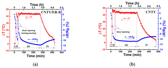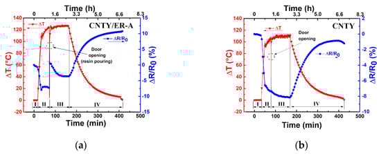 Figure 5 shows the fractional change of the electrical resistance (ΔR/R0) and temperature change (ΔT) of a representative CNTY/ER-B specimen (Figure 5a) and freestanding CNTY (Figure 5b), using the temperature program depicted in Figure 2 with T1 = 60 °C.