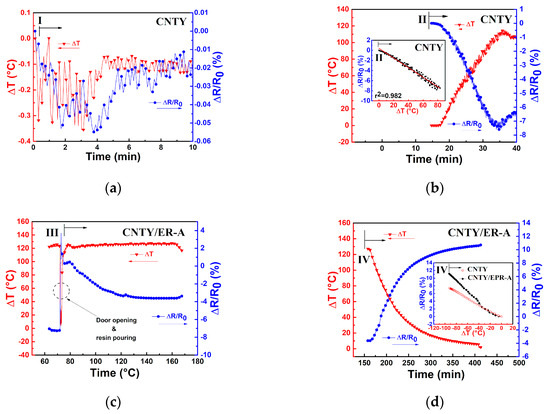 Finally, zone IV is a cooling zone for the specimen containing the CNTY and (partially cured) resin, so a thermoresistive sensitivity for the CNTY embedded in the resin during the cooling process (αC) was calculated from this zone as,