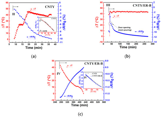 Details of each zone of the curing process of CNTY/ER-B are shown in Figure 6. At zone I (not shown) and zone II (Figure 6a), the values of SNRCNTY and αHCNTY of CNTY/ER-B specimens (Figure 5a) were similar to those of CNTY/ER-A specimens (see Table 3), since actually only the freestanding CNTY is present in both experiments. However, ΔR/R0 for CNTY/ER-B specimens at zone III decreases from ~ −1.9% (at the beginning of zone III) to ~ −11.7% (at the end of the zone III, Figure 6b). This behavior could be attributed to the onset of polymerization and chemical shrinkage of the polymer ER-B [19,22], and probably affected by electron transfer from the resin [38]. For the freestanding CNTYs, the value of ΔR/R0 does not show significant changes at zone III (see Figure S2b of the Supplementary Materials) in comparison to CNTY/ER-B. However, the individual CNTY shows sensitivity in ΔR/R0 (~2%) when the door of the oven was opened. At zone IV, the value of (ΔR/R0)RES at the end of the experiment was ~ −9.5% for CNTY/ER-B (Figure 5a and Figure 6c) and ~ −9.1% for the CNTY itself (Figure 5b).